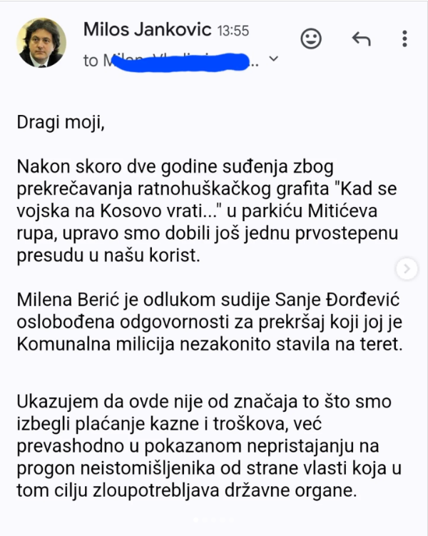 Našem advokatu, Milošu Jankoviću, juče je uručena presuda Prekršajnog apelacionog suda u Beogradu kojom je odbijena žalba Grada Beograda – Komunalne milicije uložena protiv prvostepene presude Prekršajnog suda u Beogradu kojom je naš Milan Adnađ oslobođen odgovornosti zato što je u parkiću u Mitićevoj rupi krečio zid i time navodno narušavao njegov izgled. Time je presuda da Milan po tom osnovu nije kriv postala pravosnažna.